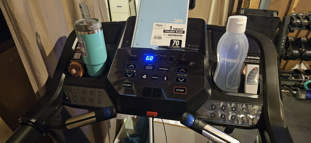 The majority of the features are all pretty standard. The display shows speed, incline, and time, along with distance, calories burned, and heart rate (which you can monitor using with the front hand bars). There’s also a three-speed fan and Bluetooth capability that allows you to connect to a number of different fitness apps, including Strava, JRNY, FitBit, and others. There are six different pre-programmed workouts (though I just stick with manual), two cupholder/hold-all openings, and two different ledges that can hold your phone, your tablet, your remote, or anything else that you might need to keep handy. It also has a foldable base, so you can fold up the base to save space when not in use.
